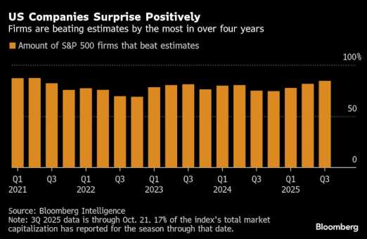 About 85% of S&P 500 firms that have reported third-quarter earnings so far have surpassed profit estimates, on course for the best performance since 2021, according to data compiled by Bloomberg Intelligence.