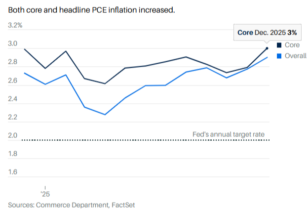 Inflation is likely to run hotter in the near term, consistent with the ISM prices‑paid signal; December’s headline and core PCE each rose 0.4% month‑to‑month, pushing annual rates to 2.9% and 3.0%, and monthly readings closer to 0.1–0.2% are needed to confirm a sustained move back toward target.