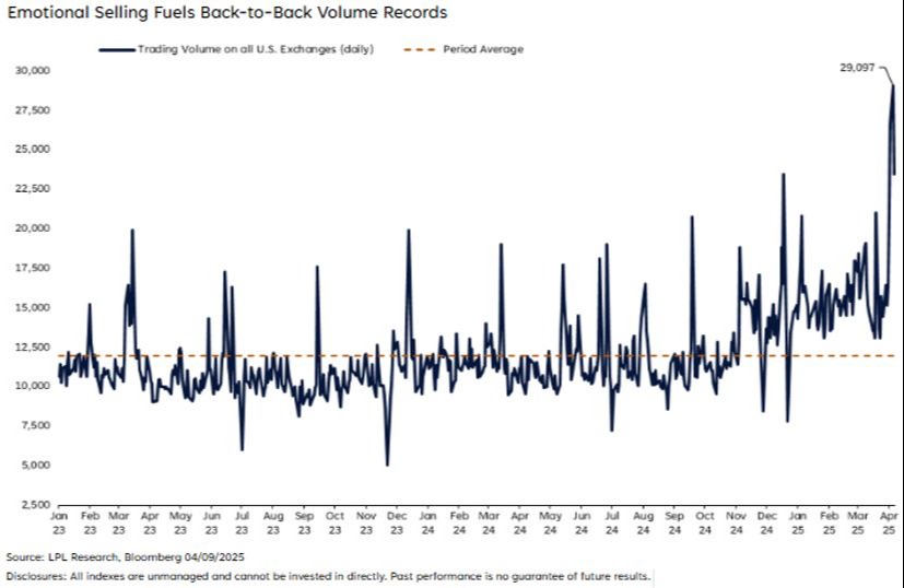 The sharp declines in U.S. equity indexes over the past week were unsettling, but far from unprecedented. Historically, similar sell-offs have occurred at least 14 other times in the past century under strict definitions of what constitutes a "waterfall decline" — and many more times under a broader criterion. Market shocks tend to trigger aggressive risk repricing, and last week’s tariff announcement was a prime example. Few expected the sheer magnitude of the tariffs announced, making them a true shock to the system. Initially, markets responded quite rationally, trimming exposure to risk in an orderly fashion. However, by Friday, emotional selling had firmly taken over as evidenced by the highest volume session in the history of the U.S. stock market (and again on Monday), which saw many pockets of the market pushed to levels that didn’t really seem all that rational.