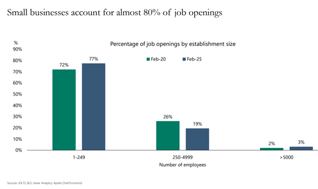Almost 80% of job openings in the US economy are in businesses with less than 250 workers, and the share of job openings in small businesses has been growing over the past five years.