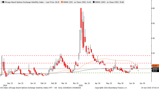 Escalating tensions between Israel and Iran over the last couple of weeks failed to create much panic in the VIX. The fear gauge rose to only 22.75 at its peak last week despite brewing uncertainty over the degree of U.S. involvement in the conflict and whether oil supplies from the region would be disrupted. After the dust settled from U.S. airstrikes on Iranian nuclear facilities and Iran’s attempted (and telegraphed) retaliatory strike on a U.S. base in Qatar, an apparent ceasefire has been reached between Israel and Iran (although reports this morning suggest Iran may have breached the agreement).