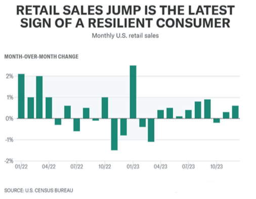 - December retail sales out Wednesday showed U.S. consumer spending continued to prove resilient to round out 2023, pushing back against fears economic growth stalled in the year's final months.