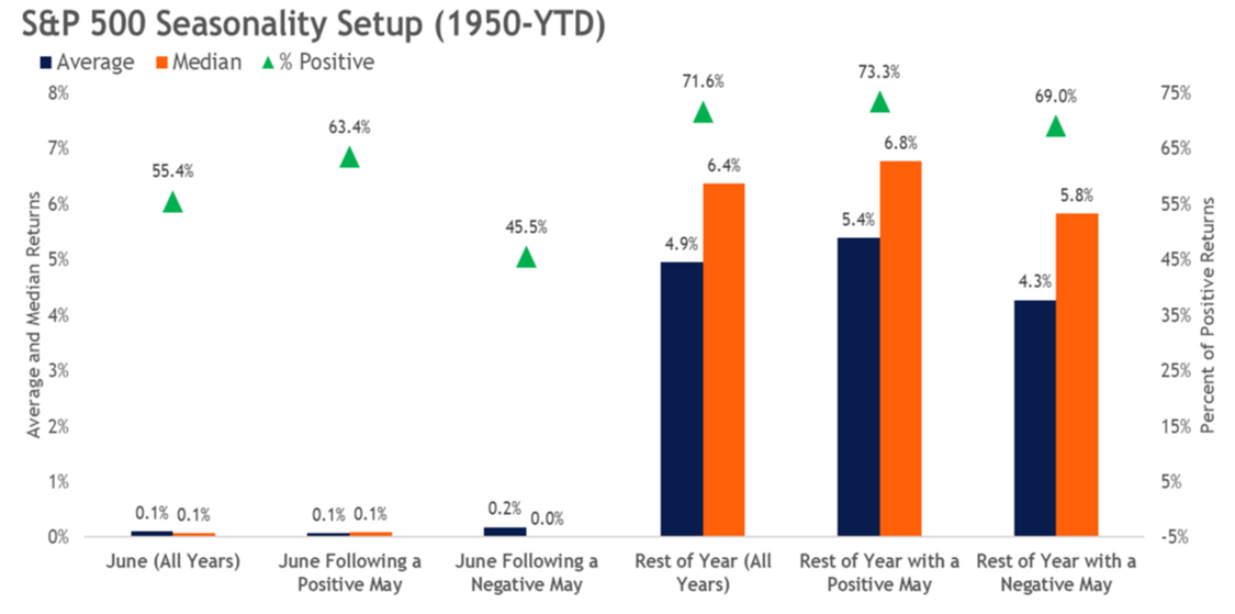 - As of May 29th, 2024 and today being the last trading day of the month, the S&P 500 is up 4.6%, enough to qualify for the sixth-best May since 1950. The rebound back to record highs has also pared April’s 4.2% drop. Perhaps April showers bring May flowers is a better market analogy than “Sell in May and Go Away”.
