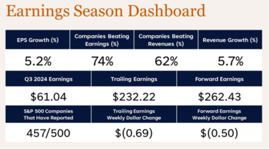 - With 90% of S&P 500 companies having reported Q3 results, S&P 500 earnings per share (EPS) growth is tracking to roughly 8% year over year excluding Boeing (BA) losses and Apple's (AAPL) substantial European tax settlement.