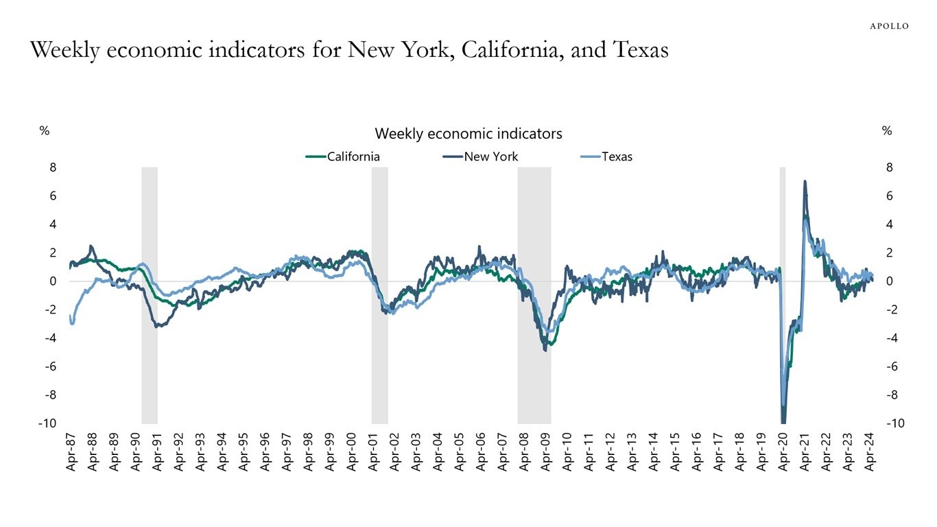 Source: Baumeister, Christiane, Danilo Leiva-Leon, and Eric Sims (2024), “Tracking Weekly State-Level Economic Conditions,” Review of Economics and Statistics, 106(2), 483-504., Apollo Chief Economist. Note: The economic conditions indices are computed with mixed-frequency dynamic factor models with weekly, monthly, and quarterly variables that cover multiple dimensions of state economies. The indices are scaled to 4-quarter growth rates of US real GDP and normalized such that a value of zero indicates national long-run growth
