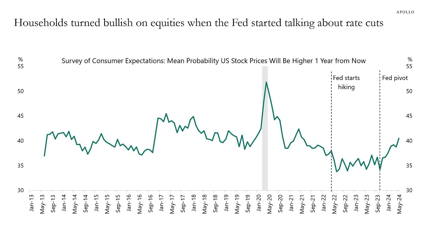 Since the Fed started talking about rate cuts, households have turned more and more positive on equities, see chart below.