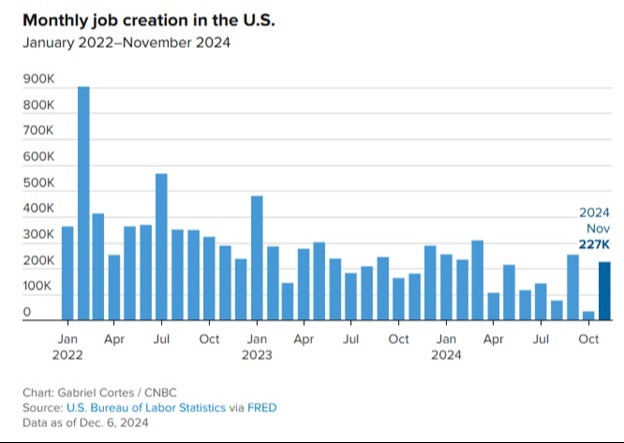 - The U.S. economy added 227,000 jobs in November 2024, surpassing expectations and staging a robust rebound from the previous month. Notably, job gains for October were revised upward to 36,000 from 12,000, and September’s gains were adjusted to 255,000 from 223,000.