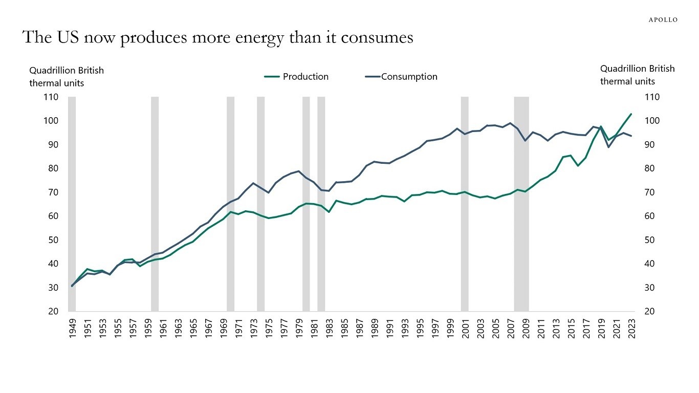 For the first time in more than 60 years, US energy production is now higher than US energy consumption, see chart below.