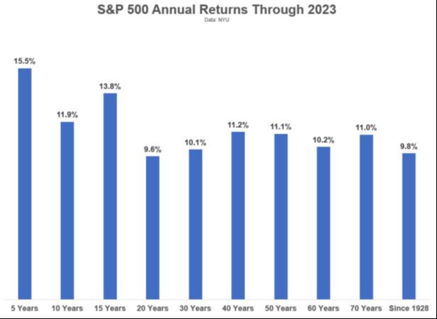 - These are the annualized returns for the S&P 500 through the end of 2023 over various periods: